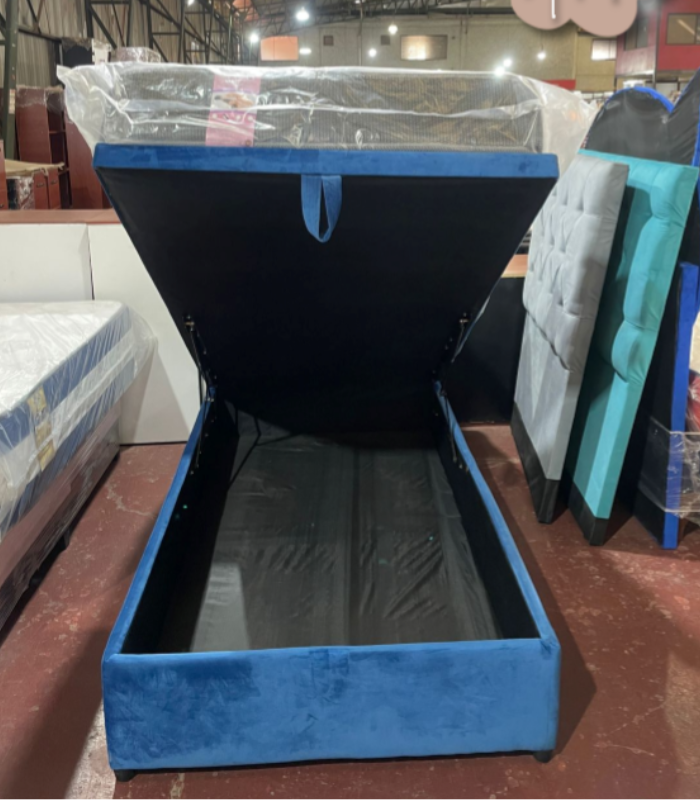 Cama de una plaza tipo baúl con sistema de almacenamiento oculto, apertura fácil y diseño moderno tapizado. Ideal para optimizar espacios pequeños y mantener tu dormitorio organizado con estilo.