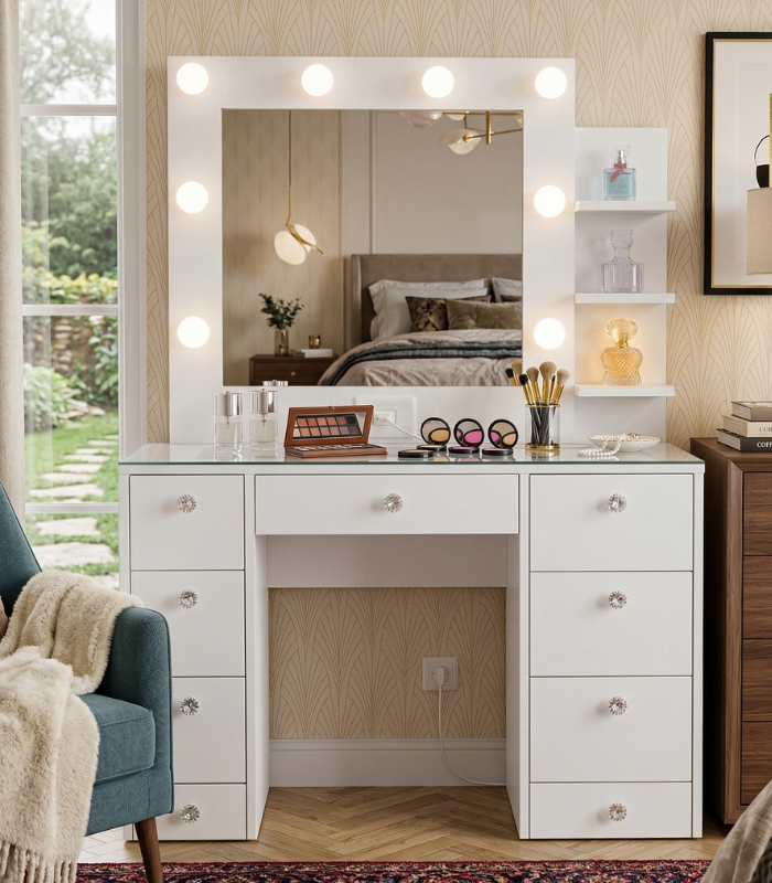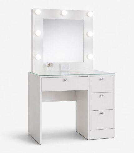 Perfecto para amantes del maquillaje, profesionales de la belleza o quienes desean un tocador amplio con cajones, este modelo convierte cualquier espacio en un verdadero estudio de belleza.