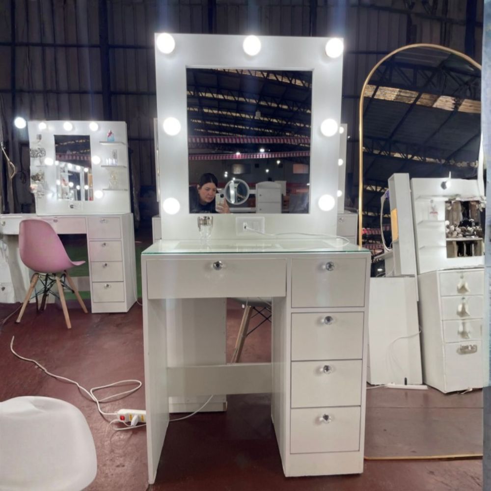 Tocador Hollywood moderno con espejo iluminado LED, ideal para crear tu espacio de maquillaje perfecto. Incluye amplios cajones organizadores, cubierta de vidrio templado y diseño elegante en color blanco. Perfecto para quienes buscan estilo, orden y funcionalidad en un solo mueble.
